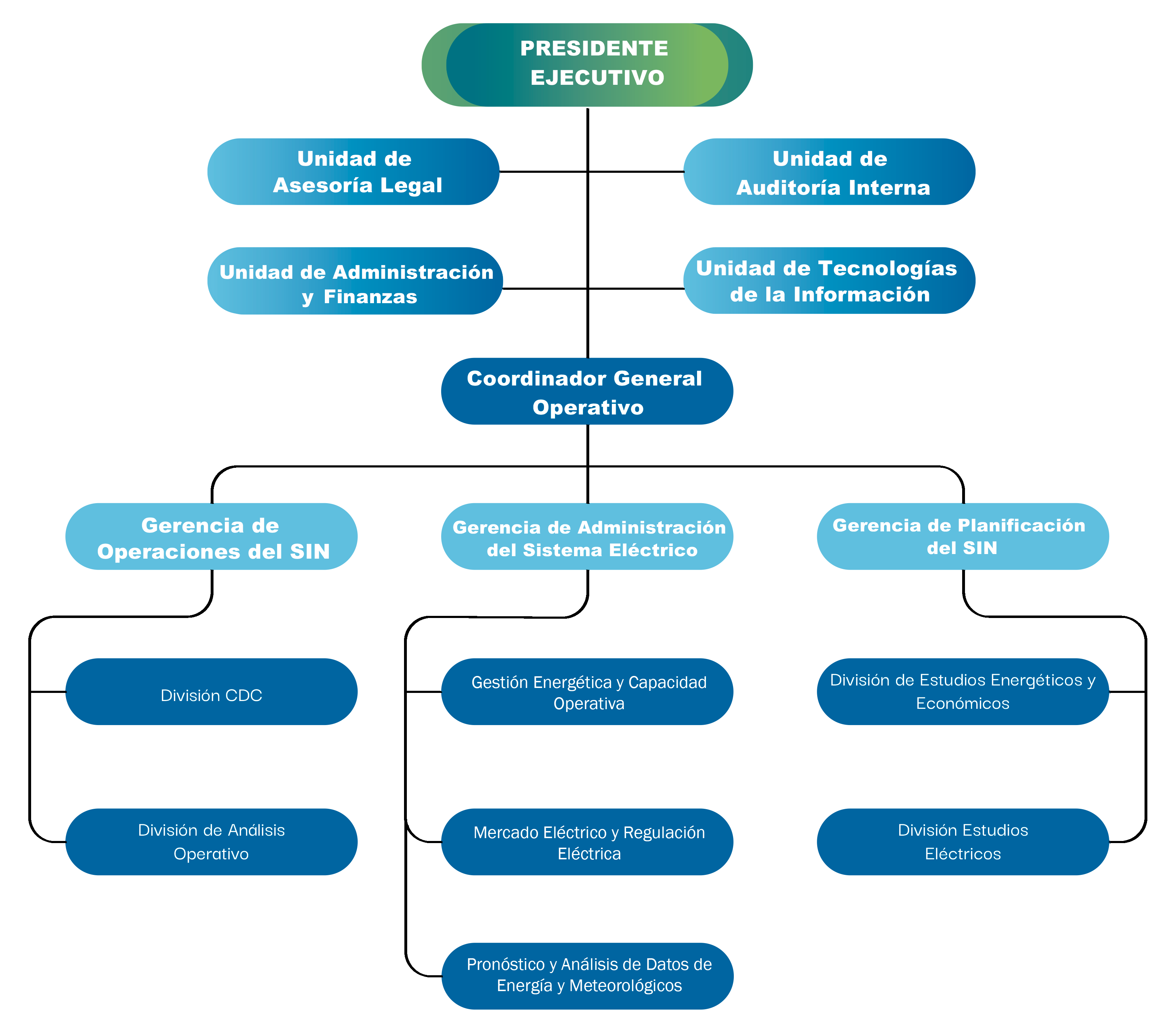 El CNDC está organizado en un Comité de Representantes y el Órgano Técnico Administrativo que funciona bajo la responsabilidad ejecutiva del Presidente del CNDC. Mediante Decreto Supremo Nº 29624, se aprueba el Reglamento de Funciones y Organización del CNDC, modificado por la disposición Final Segunda del Decreto Supremo N° 071 y N° 29894 de 07 de febrero de 2009, que establece que el Presidente del CNDC, es la máxima autoridad ejecutiva del CNDC. El Comité de Representantes, está compuesto por: El Presidente que es nominado por el Ministerio de Hidrocarburos y Energías, un representante de las empresas generadoras, un representante de las empresas transmisoras, un representante de las empresas distribuidoras y un representante de los consumidores no regulados. El Comité de Representantes celebra reuniones periódicas para tratar asuntos relacionados con el funcionamiento del MEM, adoptando decisiones que son obligatorias para los Agentes del MEM, conforme establece el Artículo 18 del ROME, aprobado mediante Decreto Supremo Nº 26093, de fecha 2 de marzo de 2001. Según el marco legal vigente, el CNDC está conformado por el Comité de Representantes y el Órgano Técnico Administrativo de acuerdo a la siguiente organización: